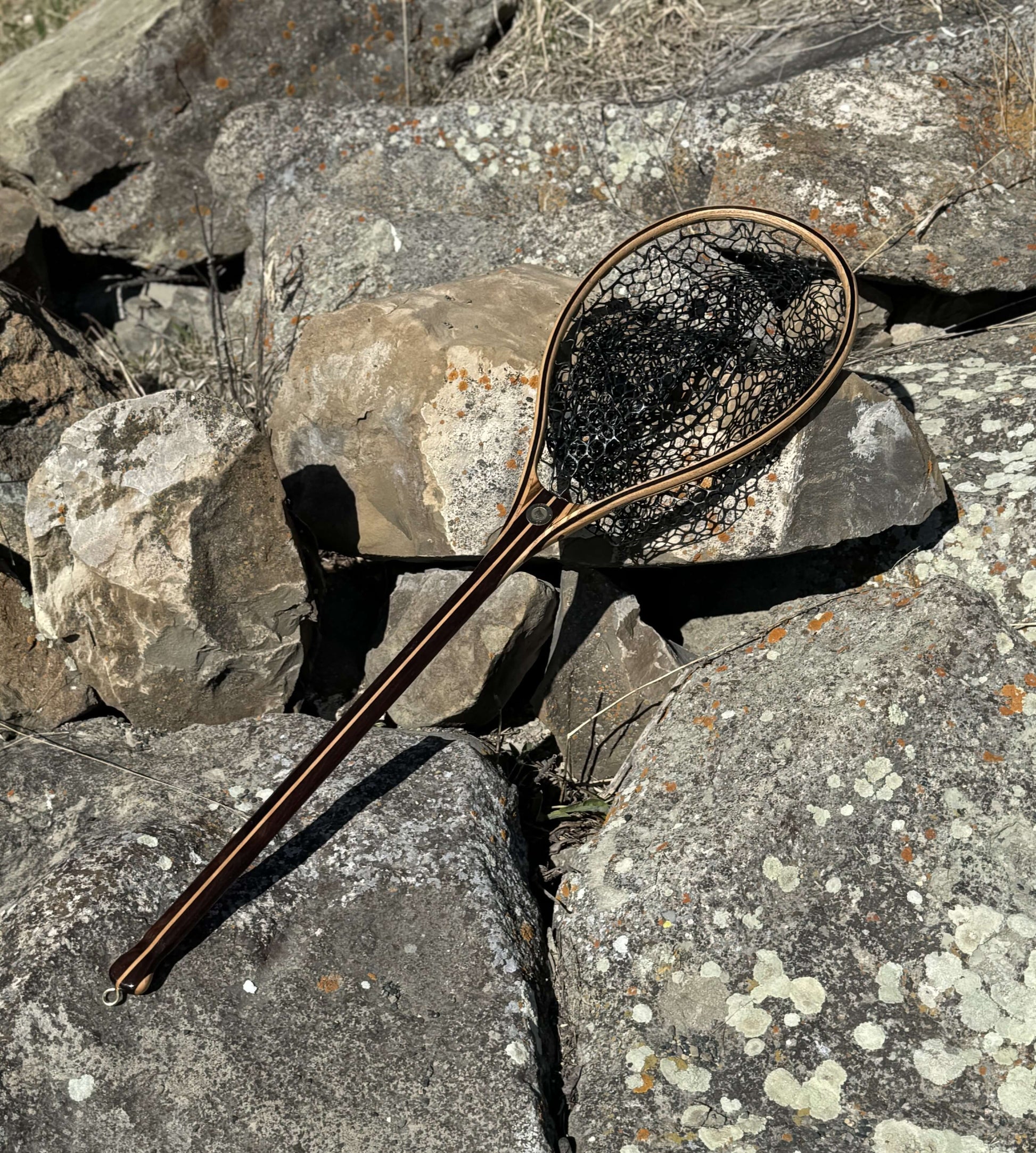 The Montana Net Co. Standard Boat Net is Peruvian Walnut Handle with Basswood Accent, an Ash Hoop with Peruvian Walnut Accent, with an Obsidian Net Bag.